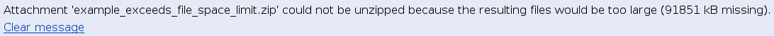 If the resulting unpacked files exceed the limit of filespace for attachments, you get this warning.